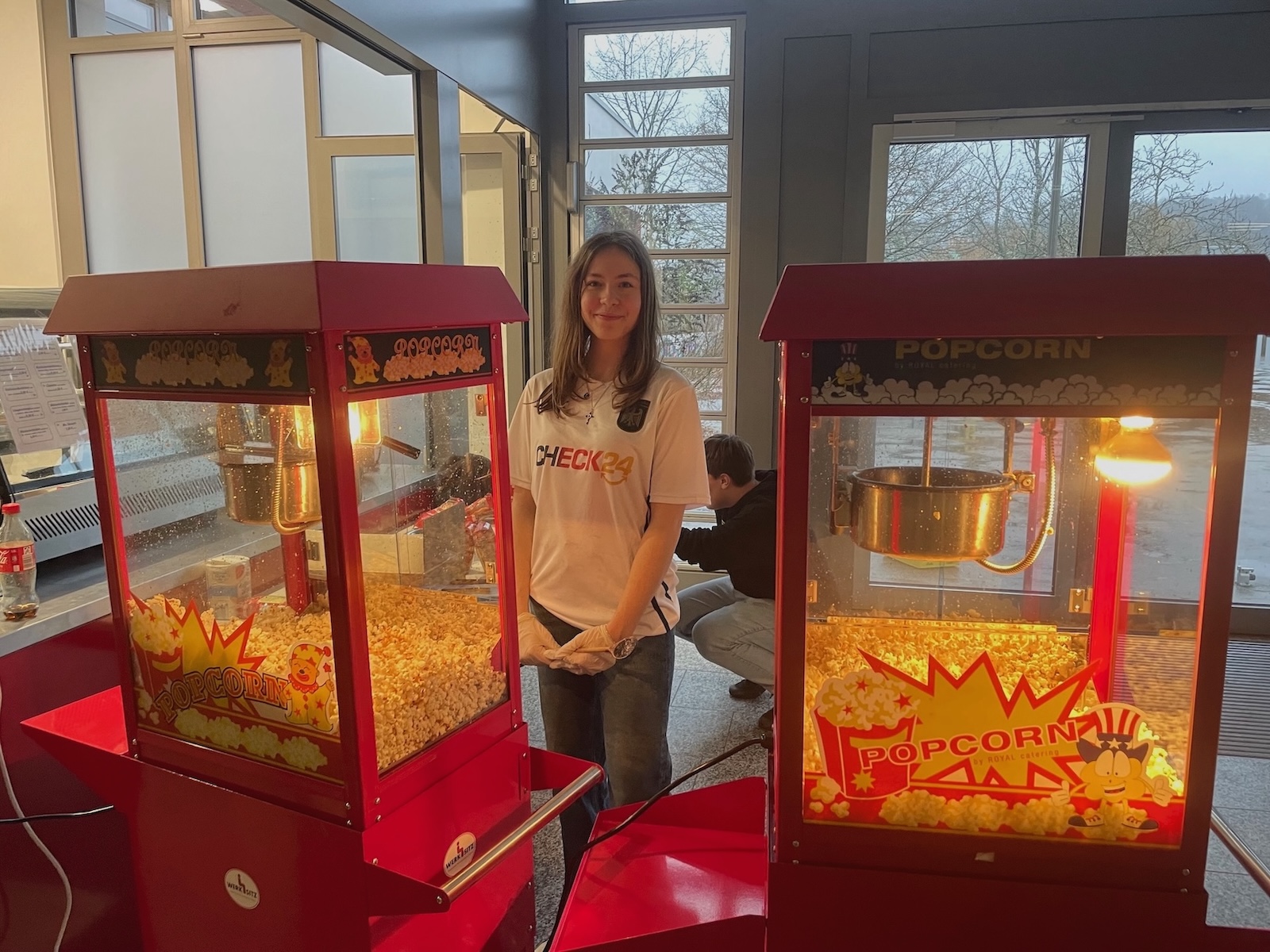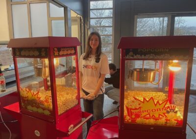 Im SJ 24/25 erweiterte die AG Schülerfirma erstmals ihr Profil und gründete bewusst ein Dienstleistungsunternehmen: „Popcorn & Perspektiven“. Die Firma betrieb ein eigenes Schulkino in der Aula, in dem Filme gezeigt wurden, die den Blick auf gesellschaftliche Herausforderungen, Diversität und unterschiedliche Lebensrealitäten erweitern sollten. Begleitet wurde das Ganze durch frisches, selbstgemachtes Popcorn – ganz im Sinne eines echten Kinoerlebnisses.